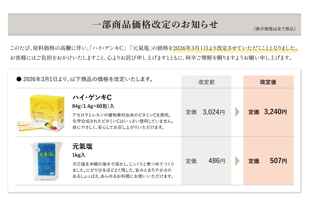 2026年3月1日より、原料価格の高騰に伴い「ハイ・ゲンキC」の価格を改定しました。。