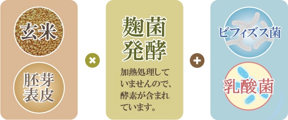 玄米胚芽・表皮(国産)、フラクトオリゴ糖(食物繊維)、玄米、ビフィズス菌末、植物性乳酸菌、麹菌